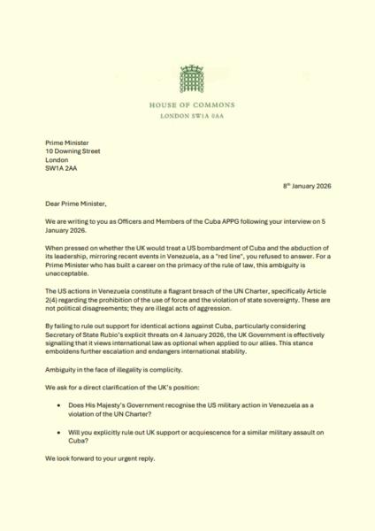 Letter to Prime Minister: Recognise US military action in Venezuela as a violation of the UN Charter