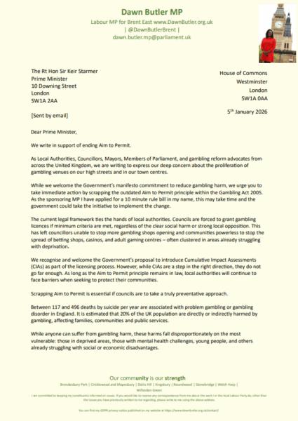 Letter to Prime Minister: End ‘Aim to Permit’ and empower councils to block gambling shops from our high streets
