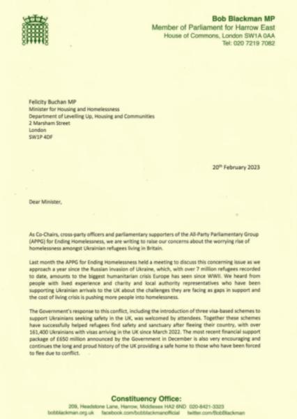 Letter to Minister for Housing and Homelessness about the rise of homeless Ukrainian refugees