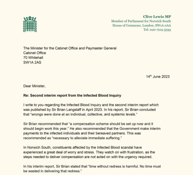 Letter to the Minister for the Cabinet Office on the Infected Blood Inquiry