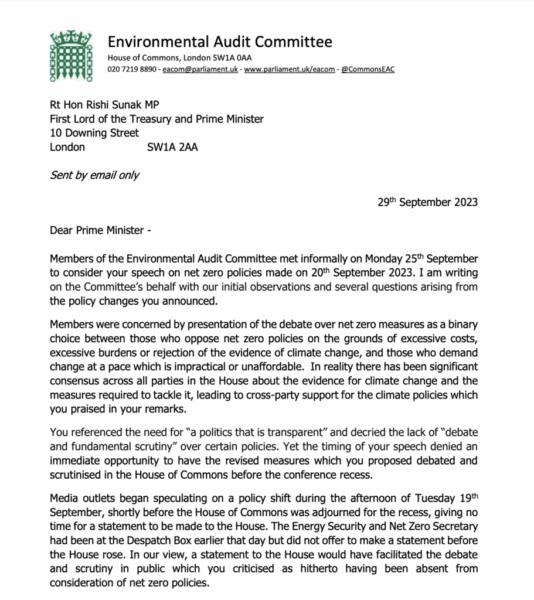 Environmental Audit Committee: Letter to the Prime Minister about net zero u-turn