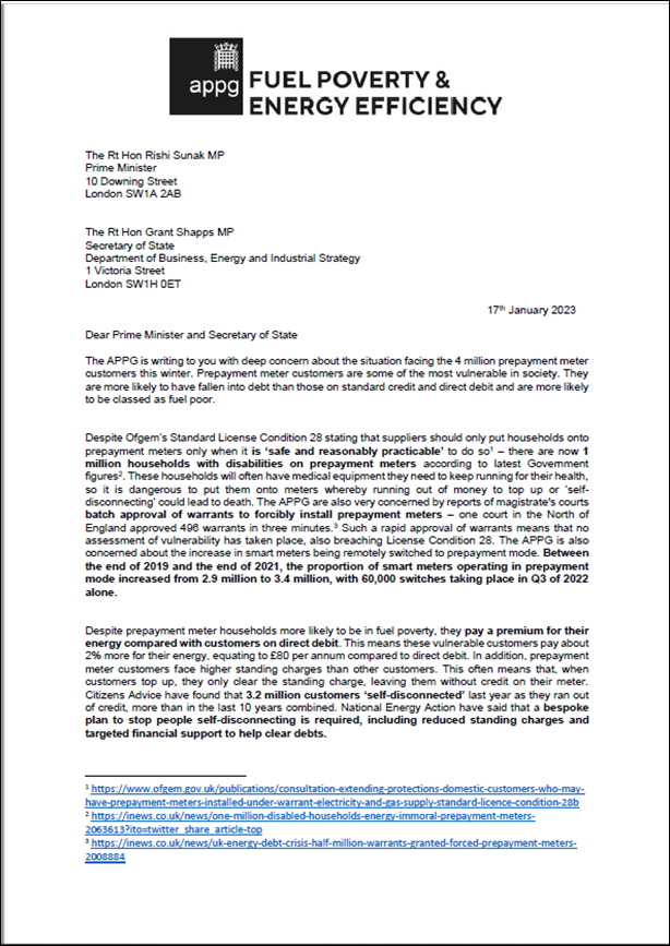 As a member of the APPG on Fuel Poverty and Energy Efficiency, I have joined 40 of my colleagues in Parliament to write to the Prime Minister and the Secretary of State for Business, Energy and Industrial Strategy about the situation surrounding prepayment meter customers.