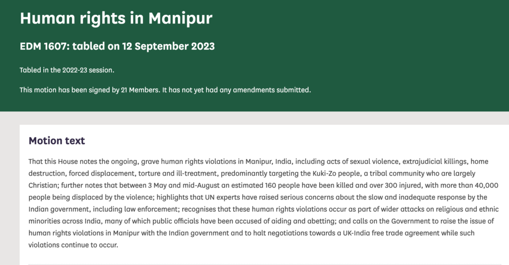 The EDM notes the ongoing, grave human rights violations in Manipur, India. This includes acts of sexual violence, extrajudicial killings, home destruction, forced displacement, torture and ill-treatment, predominantly targeting the Kuki-Zo people, a tribal community who are largely Christian.