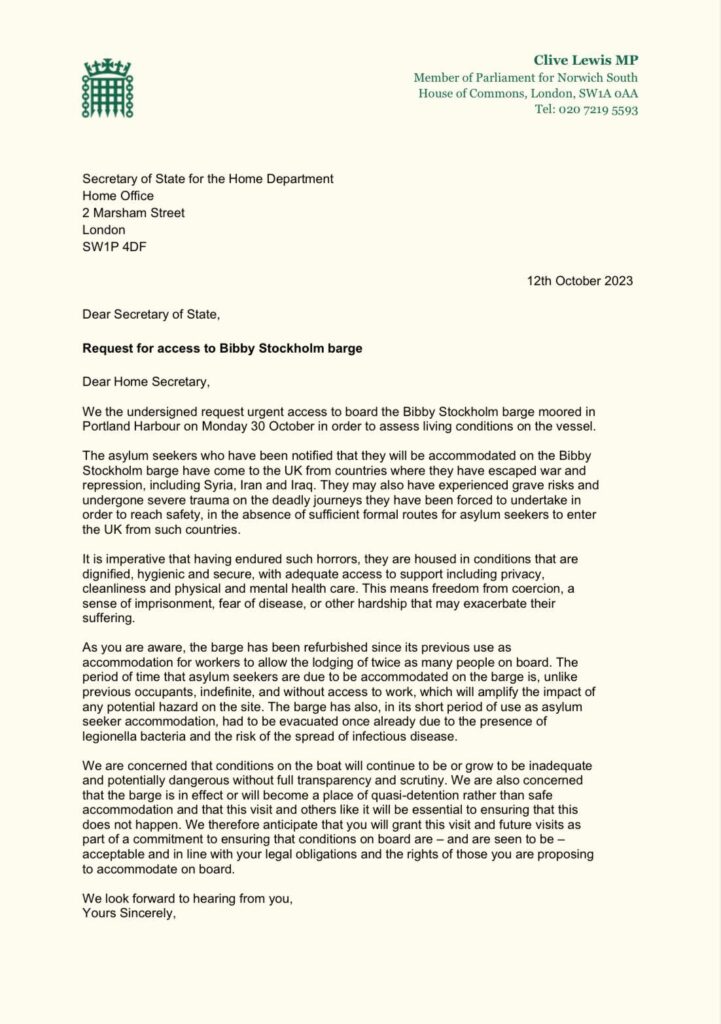 I have written to the Home Secretary Suella Braverman requesting an urgent visit to assess living conditions for asylum seekers on the Bibby Stockholm barge.