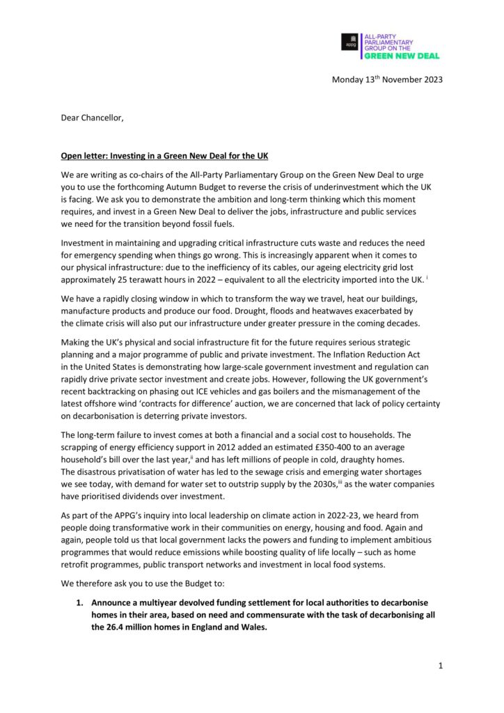 As co-chair of the All Party Parliamentary Group on the Green New Deal, I and Caroline Lucas MP have written to the Chancellor, Jeremy Hunt, demanding him to invest in a Green New Deal and the UK’s infrastructure and services.