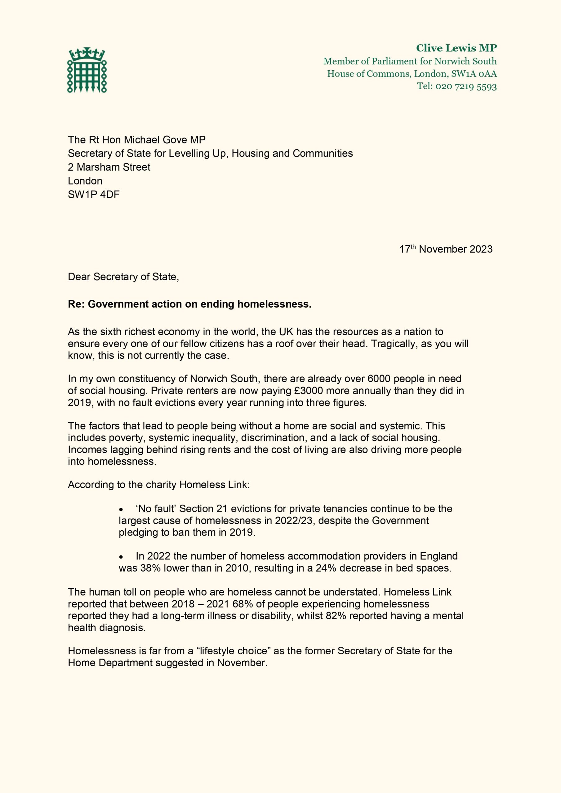 I have called on the Secretary of State for Levelling Up, Housing and Communities to act on the homelessness and housing crisis.