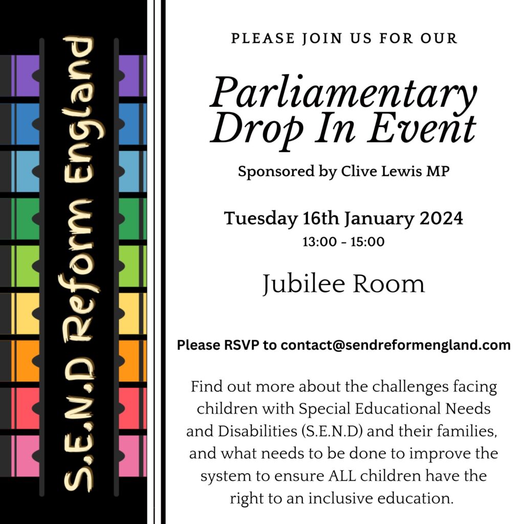 I am hosting a drop-in in Parliament, to show support for SEND reform on Tuesday the 16th of January 2024.