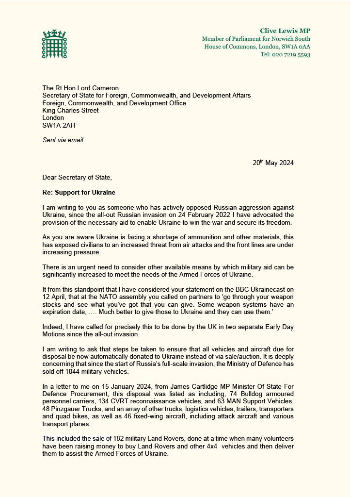 I wrote a letter to the Foreign Secretary, Lord Cameron, asking that military resources due for disposal be donated to the Armed Forces of Ukraine.