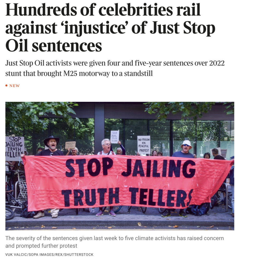These sentences have been made using the Tories’ draconian Police, Crime, Sentencing and Courts Act 2022. So extreme is this law and its impact on environmental defenders, that earlier this year UN Special Rapporteur Michel Forst “seriously question[ed] the necessity and proportionality of such conditions for persons engaging in peaceful protest” and was “distressed to see how environmental defenders are derided by some of the mainstream UK media and in the political sphere“.