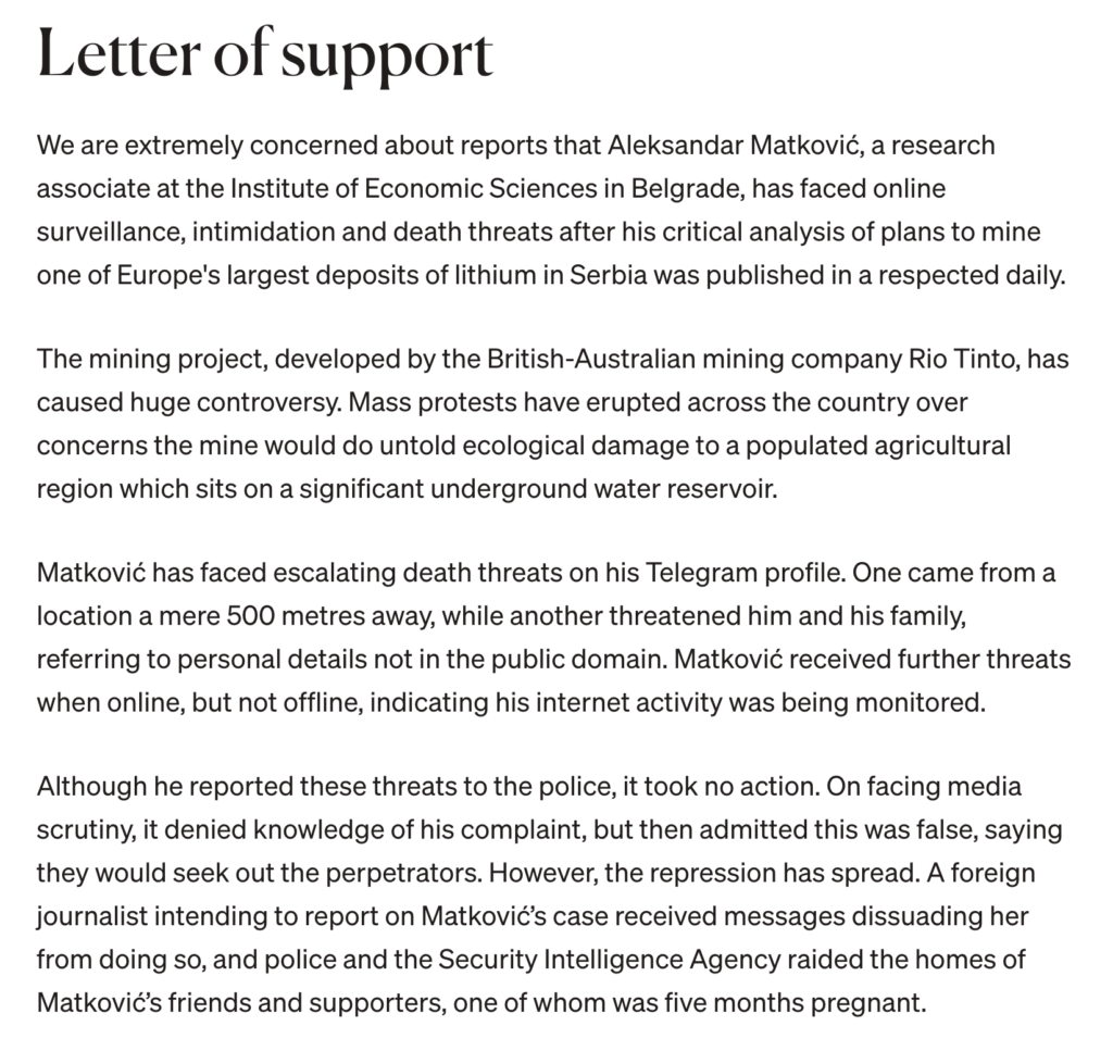 I have signed a letter of support from the Transnational Institute. The letter is for Aleksandar Matković, a research associate at the Institute of Economic Sciences in Belgrade. Aleksandar has faced online surveillance, intimidation and death threats after his critical analysis of plans to mine one of Europe’s largest deposits of lithium in Serbia was published.