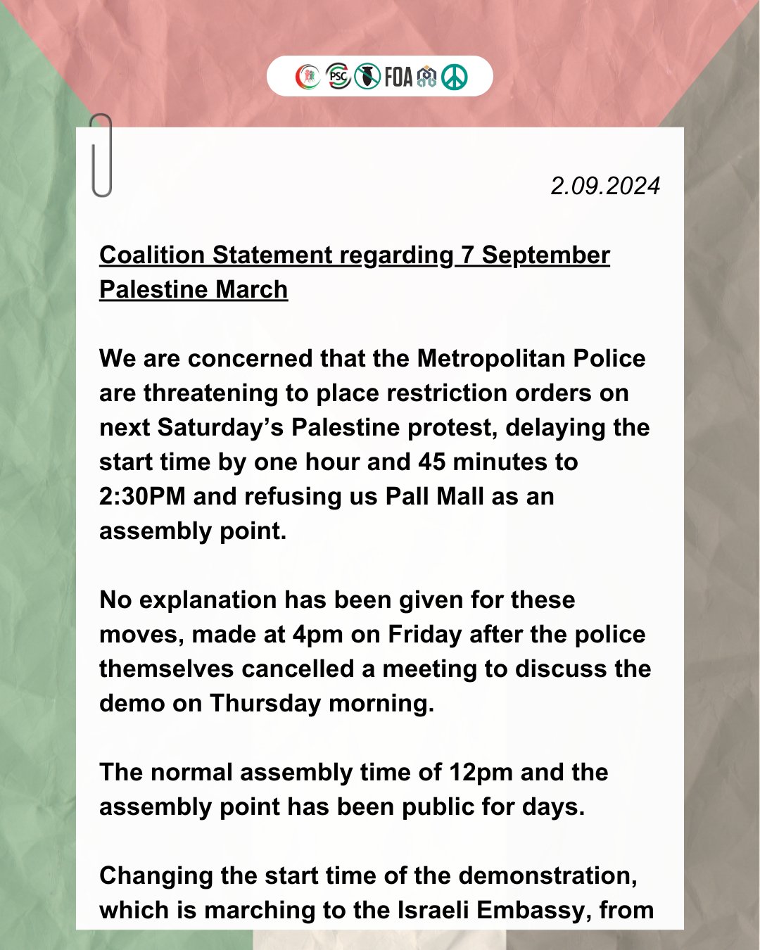 The statement notes that the Metropolitan Police are threatening to place restriction orders on a Palestine protest on September 7th. These orders would delay the start time by 1 hour and 45 minutes and also prevent the use of Pall Mall as an assembly point. This happened even though the original assembly time was 12pm and the assembly point had been public for days, with organisers first informing the police of their plans on the 8th of August.