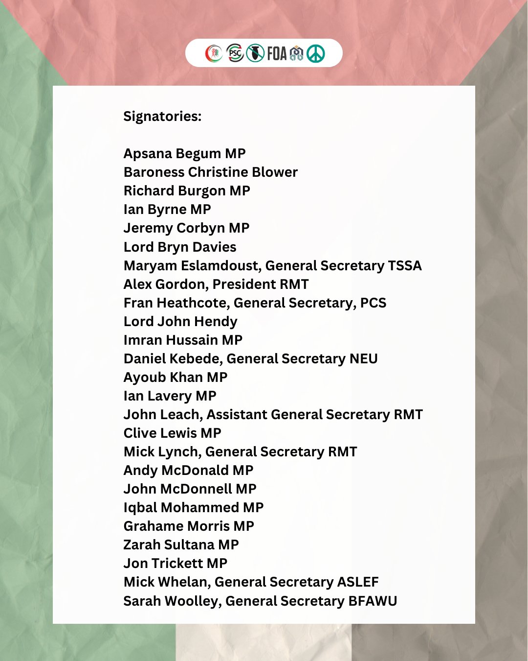 I have signed a joint statement from the Palestine Solidarity Campaign, Palestinian Forum in Britain, Friends of Al-Aqsa, Stop the War Coalition and the Campaign for Nuclear Disarmament.