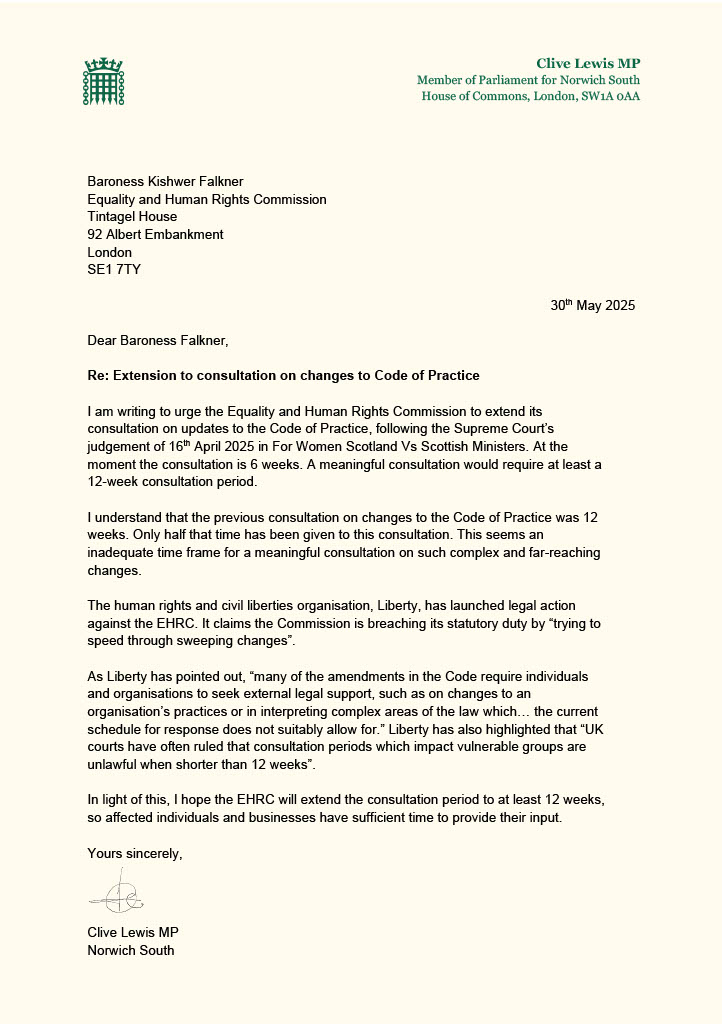 My letter reflects concerns raised by the human rights and civil liberties organisation, Liberty, which has launched legal action against the EHRC. Liberty claims the Commission is breaching its statutory duty by “trying to speed through sweeping changes”.