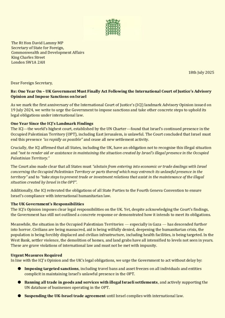 I joined over 80 MPs to write to the Foreign Secretary calling for for widespread sanctions on Israel including: