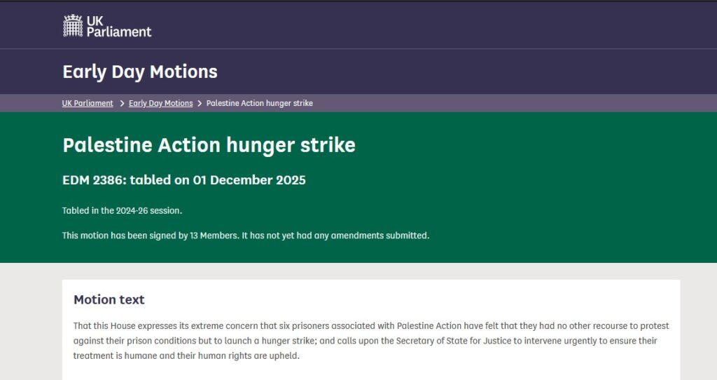I have signed Early Day Motion 2386 about the Palestine Action hunger strike, which reads: