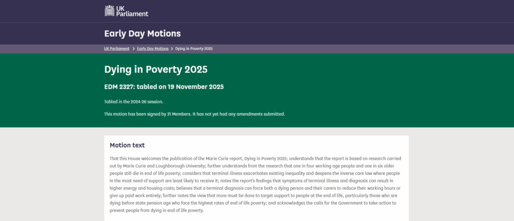 “That this House welcomes the publication of the Marie Curie report, Dying in Poverty 2025; understands that the report is based on research carried out by Marie Curie and Loughborough University; further understands from the research that one in four working age people and one in six older people still die in end of life poverty; considers that terminal illness exacerbates existing inequality and deepens the inverse care law where people in the most need of support are least likely to receive it; notes the report’s findings that symptoms of terminal illness and diagnosis can result in higher energy and housing costs; believes that a terminal diagnosis can force both a dying person and their carers to reduce their working hours or give up paid work entirely; further notes the view that more must be done to target support to people at the end of life, particularly those who are dying before state pension age who face the highest rates of end of life poverty; and acknowledges the calls for the Government to take action to prevent people from dying in end of life poverty.”