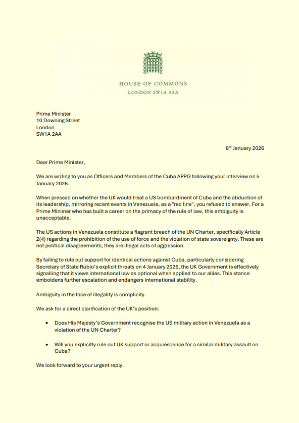 By failing to rule out support for identical actions against Cuba, particularly considering Secretary of State Rubio’s explicit threats on 4 January 2026, the UK Government is effectively signalling that it views international law as optional when applied to our allies. This stance emboldens further escalation and endangers international stability.