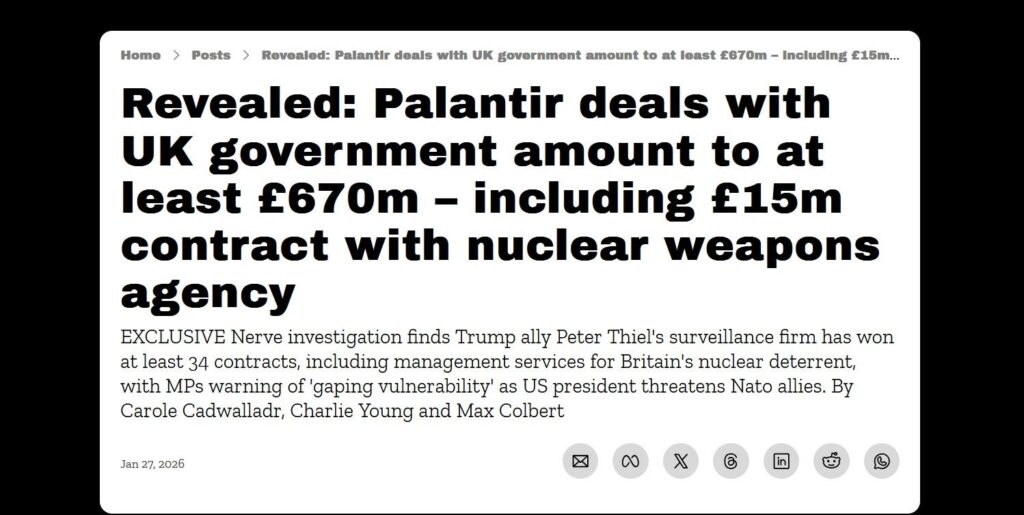 I was asked by Nerve to comment on their investigation which has found “Trump ally Peter Thiel’s surveillance firm has won at least 34 contracts, including management services for Britain’s nuclear deterrent, with MPs warning of ‘gaping vulnerability’ as US president threatens Nato allies.”