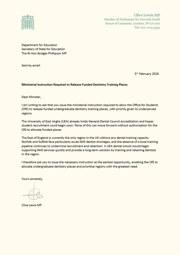 A dental school at UEA would train new dentists in Norwich, place students in local practices from their first year, and give them clear routes into NHS roles across the region once they qualify. UEA’s health courses already follow this pattern, with students based in local NHS settings throughout their training and many choosing to stay in Norfolk and Suffolk after graduation. My letter sets out these points in a clear way, and I will continue to support this work with partners across the region.