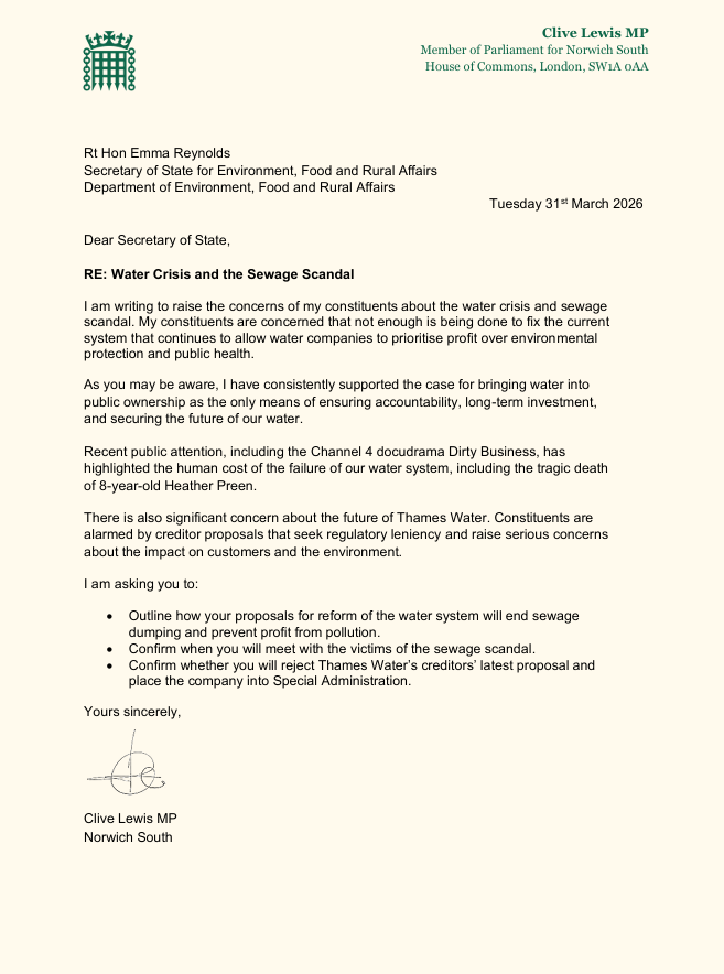 I have written to the Secretary of State for Environment, Food and Rural Affairs to raise serious concerns from my constituents about the ongoing water crisis and sewage scandal.